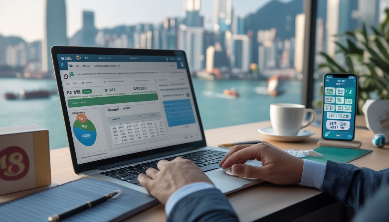 Meja kerja dengan laptop yang menampilkan situs togel online, tangan seseorang sedang menggunakan mouse, latar belakang kota Hong Kong dengan gedung pencakar langit dan pelabuhan.
